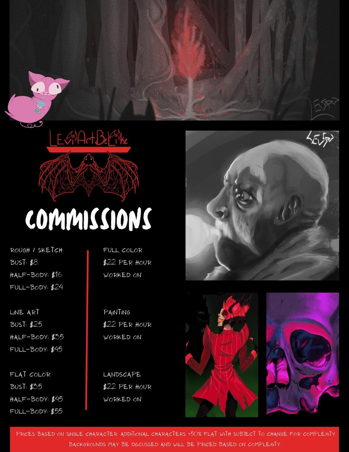Flat rate pieces must be paid up-front and larger pieces may require a fee to hold the slot. Commission slots will not be filled until payment is received.